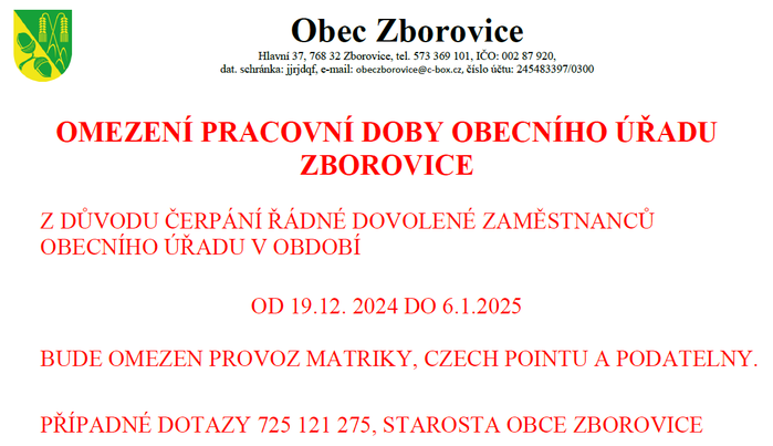 Úvod > Život v obci > Aktuality > Omezení pracovní doby obecního úřadu Zborovice 19.12.-6.1.2025