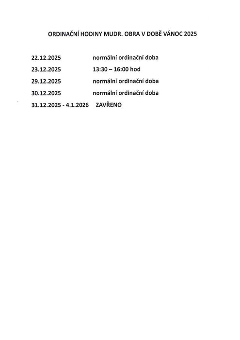 Úvod > Život v obci > Aktuality > Ordinační hodiny MUDr. Obra v době Vánoc 2025