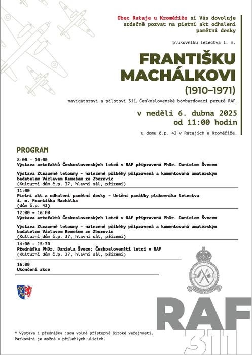 Úvod > Život v obci > Aktuality > Pietní akt odhalení pamětní desky Františku Machálkovi Rataje 6.4.2025