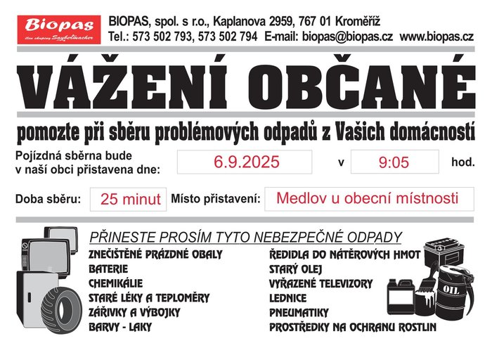 Úvod > Život v obci > Aktuality > Sběr problémových odpadů Medlov 6.9.2025