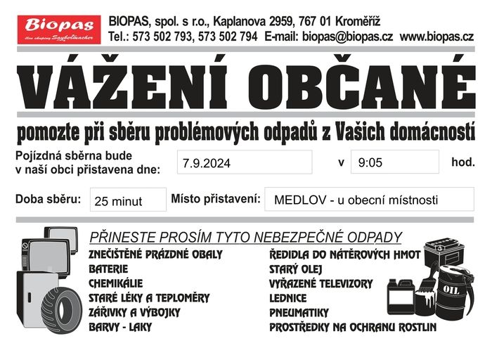 Úvod > Život v obci > Aktuality > Sběr problémových odpadů Medlov 7.9.2024
