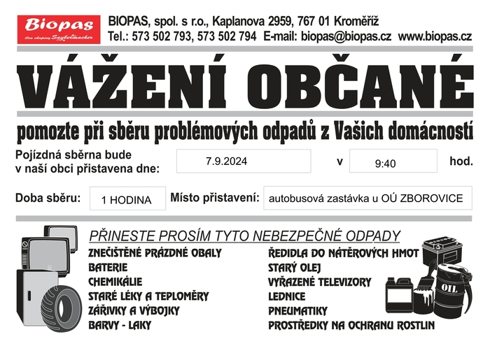 Úvod > Život v obci > Aktuality > Sběr problémových odpadů Zborovice 7.9.2024