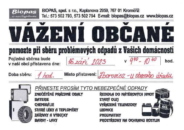 Úvod > Život v obci > Aktuality > Svoz nebezpečného odpadu Zborovice