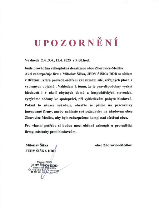 Úvod > Život v obci > Aktuality > Upozornění na velkoplošnou deratizaci