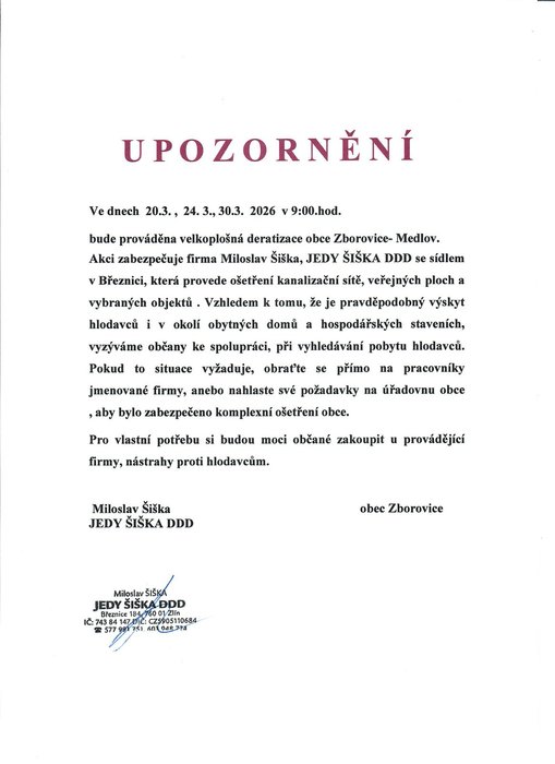 Úvod > Život v obci > Aktuality > Velkoplošná deratizace obcí Zborovice a Medlov